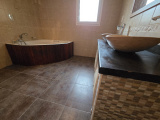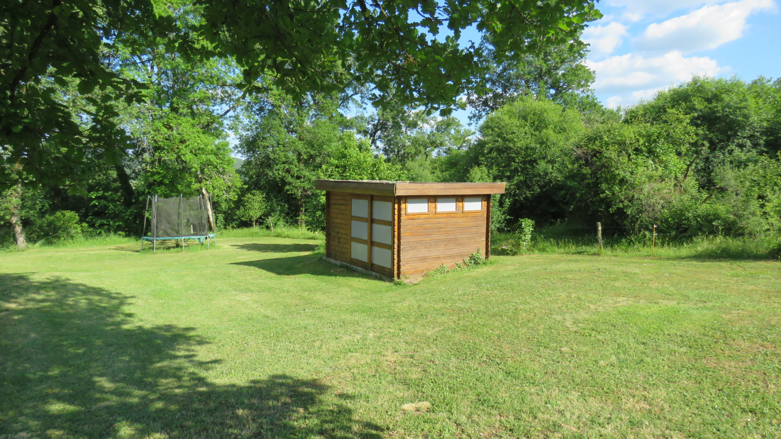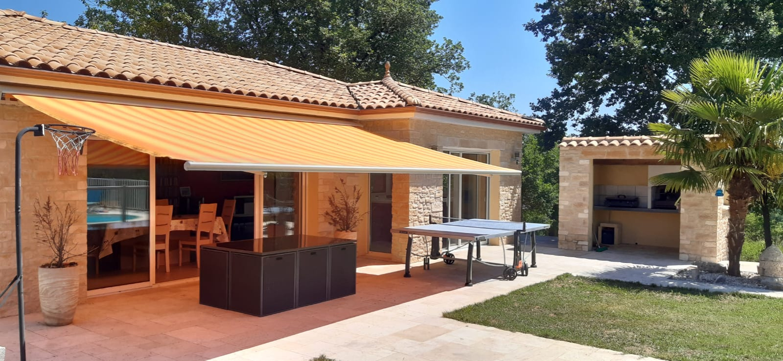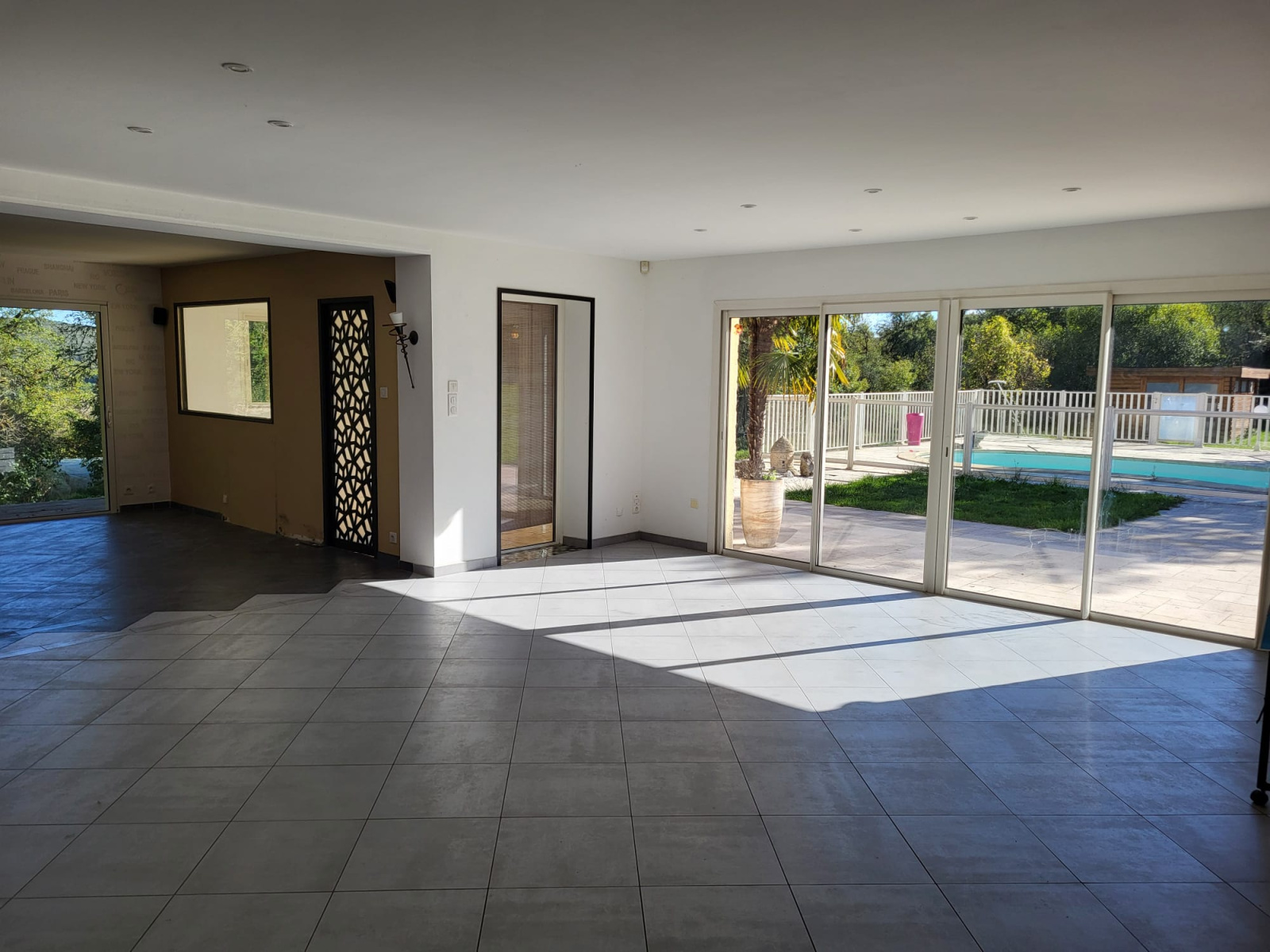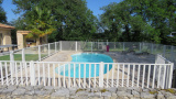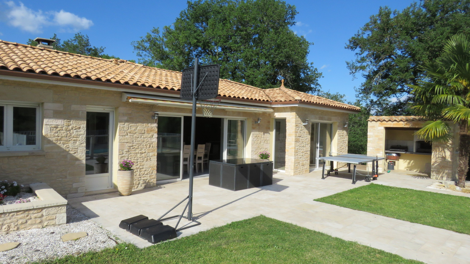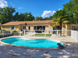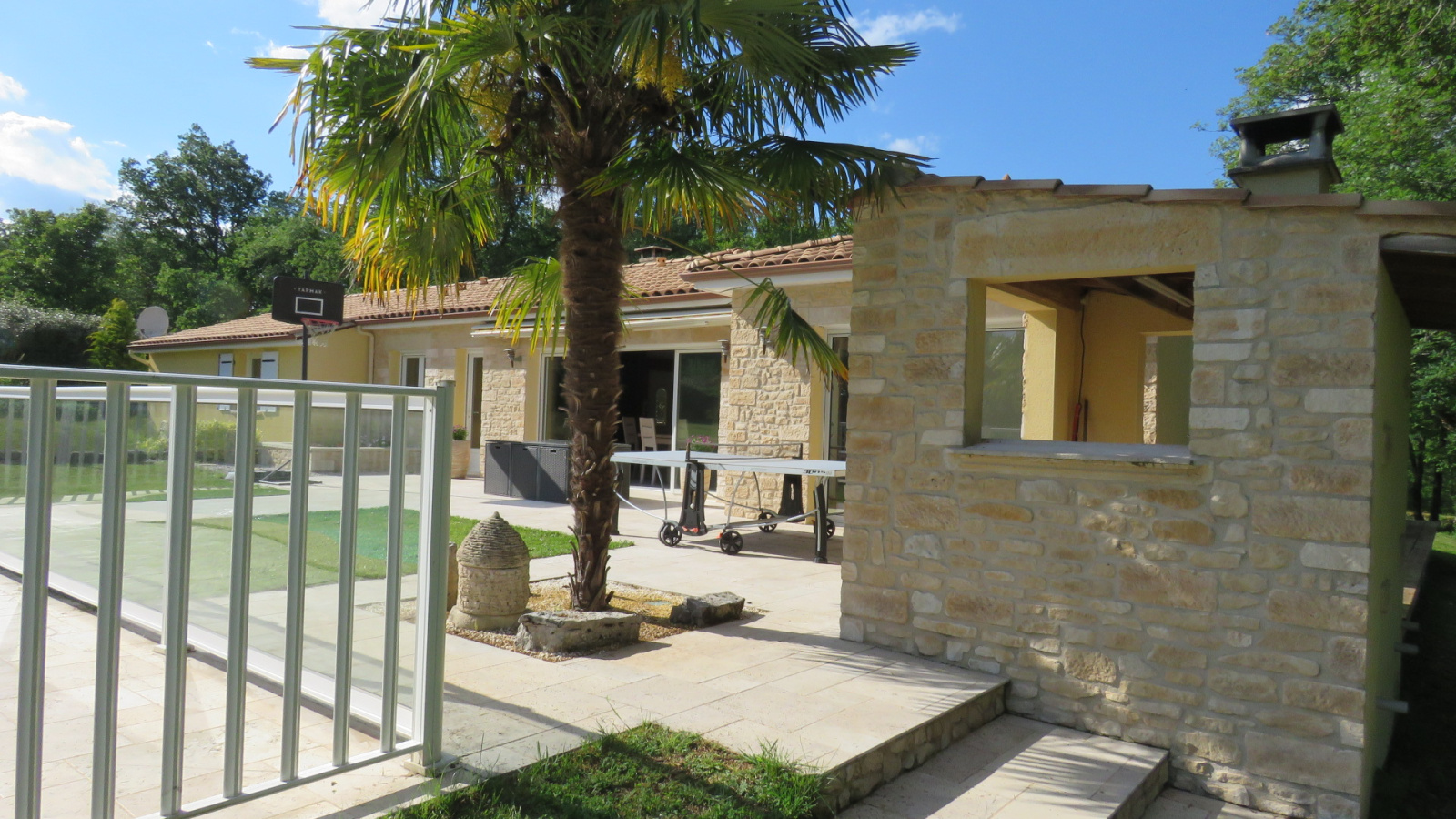 Ext : une terrasse avec une vue sur la campagne, terrain boisé. Pas de vis-à-vis. Une piscine avec son espace détente (terrasse clôturée). Double garage non attenant.