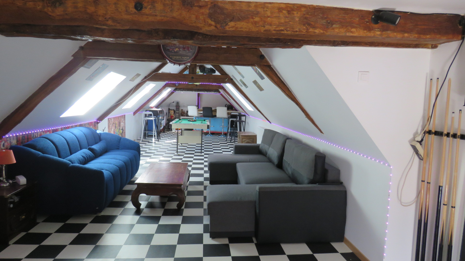 Etage : grenier aménagé (50m2) en pièce de détente. Cette pièce peut être divisée en plusieurs chambres. Chauffage central au bois. Double vitrage. volets alu+bois. Dpe: C . Assainissement individuel.